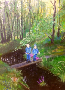 2020Tijdens een gezinsuitstapje naar het vlonderpad op het Landgoed van Tongeren zag ik dit tafereeltje om te schilderen: onze kinderen aan het vissen, in de hoop wat kikkerdril of andere interessante dingen te vangen.