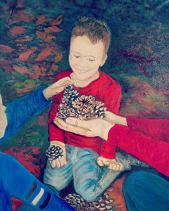 2021Onze jongste zoon Robin kan zo aanstekelijk lachen en genieten van dingen die je in de natuur kunt vinden, bijvoorbeeld slakken, stenen en dennenappels. Een moment van geluk, vereeuwigd in verf.